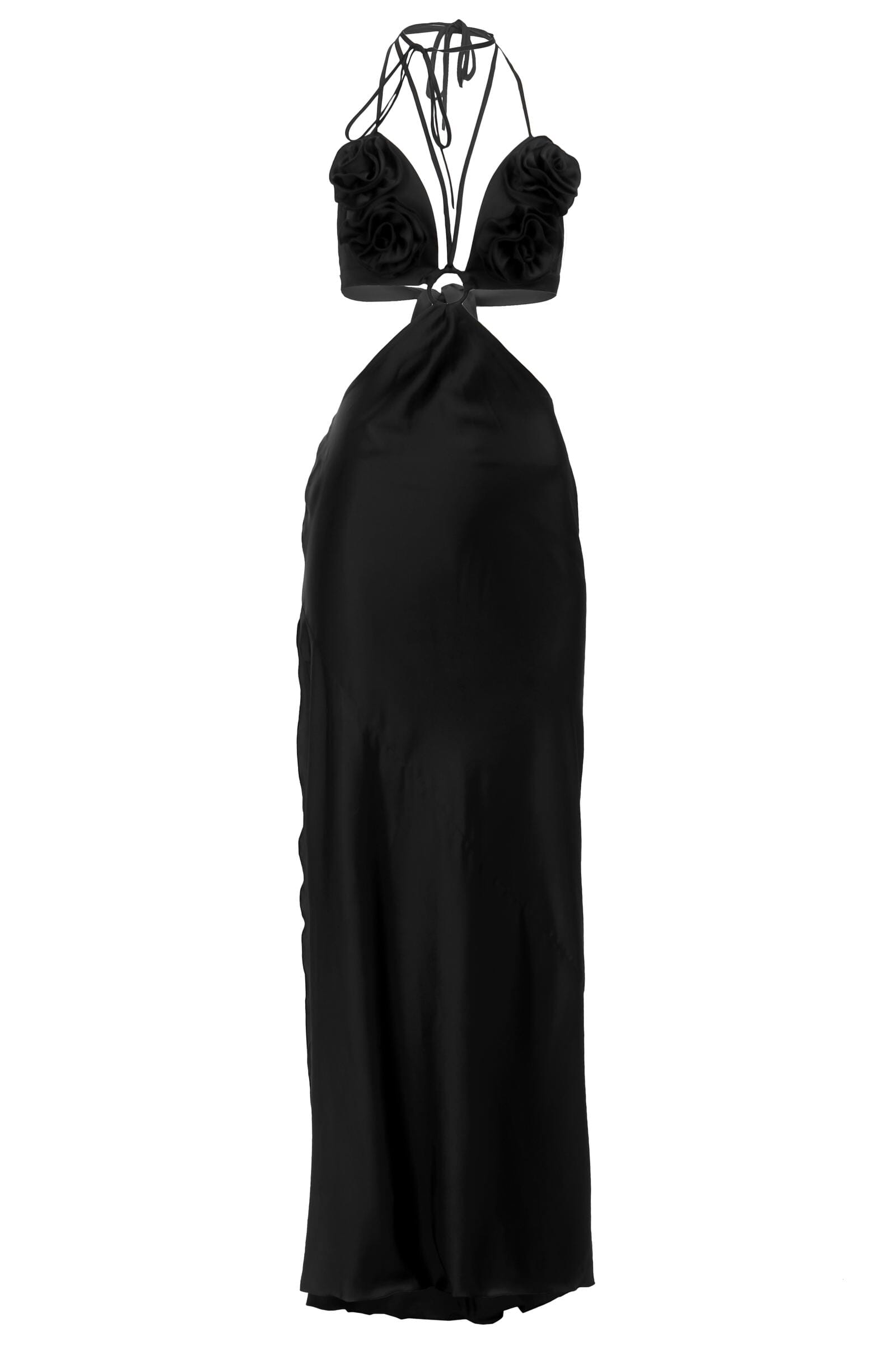 The sensuality of this dress results from precisely selected details, such as a deep neckline and ties at the neck. The romantic character is given by floral elements that add mystery and feminine tenderness.