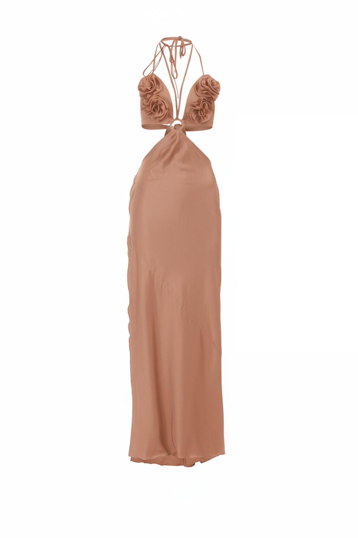 The sensuality of this dress results from precisely selected details, such as a deep neckline and ties at the neck. The romantic character is given by floral elements that add mystery and feminine tenderness.